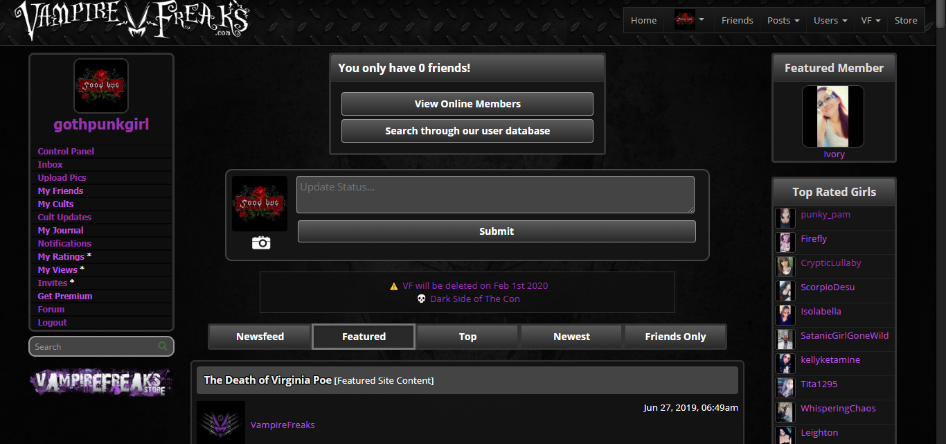 I’ve been running VampireFreaks for 20 years now and it’s been a great experience.So many ups and downs, and the website has brought so many people together. It’s been a lot of work, but hearing stories about people finding their spouses / loved ones on VF has always made it worthwhile.VampireFreaks has always been a labor of love. Recently, running the VF social network just hasn’t been enjoyable for me anymore. I’ve always taken pride in being part of a community of weirdos and freaks that can relate to each other and be supportive of each other. To be honest, it’s just lost its magic to me. The internet isn’t the same place it was 15-20 years ago and I’m not the same person I was either. I’d like to have our website be remembered as being a great inclusive community. I just don’t want to live my life online anymore, I like having my privacy.So I’ve decided to take down the VampireFreaks social network starting on February 1st 2020. This gives everyone over 6 months notice. If you have a premium member subscription, I recommend cancelling before this date, but we will be cancelling any subscriptions once the site is taken down. Effective immediately we are not allowing any new account creation.VampireFreaks will still exist as the VampireFreaks Online Store and as an event promotions company and you can still follow us on social media. The VF online clothing store continues to flourish and you can always find us for your wardrobe needs. Our flagship event Dark Side of the Con has been doing amazingly well and growing by leaps and bounds every year. We have Steampunk Con this weekend which is a big 3-day steampunk convention in NJ. Our NYC club nights have been doing very well. I’m also a freelance website programmer and I’m always trying out new projects and I just have too many things going on. VF will continue to bring people together, but in real life at events such as Dark Side of the Con. I know this limits us to only people in certain areas, but it’s more fulfilling for us and we hope to expand to more areas. I’ve spent so much of my time online and I’ve realized that nothing compares to just spending quality time with your friends and loved ones, interacting with the real world.
